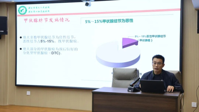 讲座中,高洪军副院长结合多年临床经验,以通俗易懂的语言,围绕《甲状腺结节的诱因及防治》,系统讲解了甲状腺结节的发病原因、分类、临床表现、检查方式等内容,特别针对办公人群久坐、压力大、作息不规律等易诱发甲状腺问题的特点,重点分享了科学预防方法,包括合理饮食、规律运动、情绪调节等实用技巧。