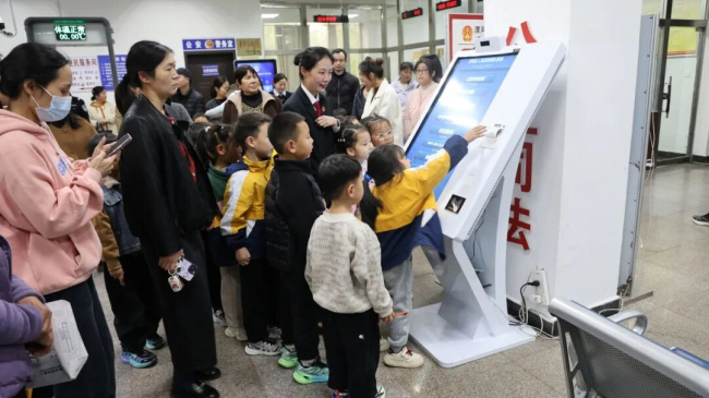 活动伊始,立案庭干警杨婧靓化身“法治向导”,用通俗易懂的语言为孩子们讲解立案流程。从安检入口的安全检查,到诉讼服务大厅的自助立案机操作演示,孩子们踮着脚尖观察、好奇地举手提问,“如果小朋友的玩具被抢了,也能来这里吗?”我院干警耐心解答:“这里是解决纠纷的地方,小朋友遇到困难要先告诉爸爸妈妈哦。”生动的互动让抽象的“立案”概念变得具体可感。