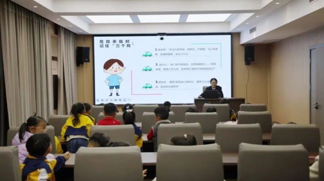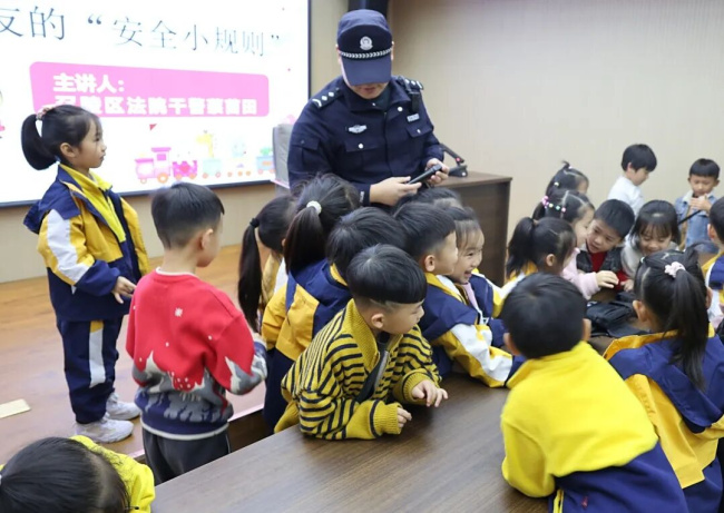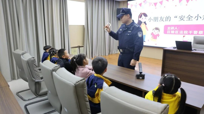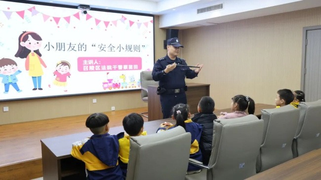 在执行局,执行局干警贺莹超向孩子们形象地解释了“执行”的意义——确保生效裁判的承诺得以兑现。随后,法警队员向孩子们展示了警用器械,并讲解了其用途和安全知识。在法警叔叔的专业指导与看护下,孩子们既满足了好奇心,也深刻体会到法律背后需要有坚强的力量来守护。讲座 筑牢安全防线
