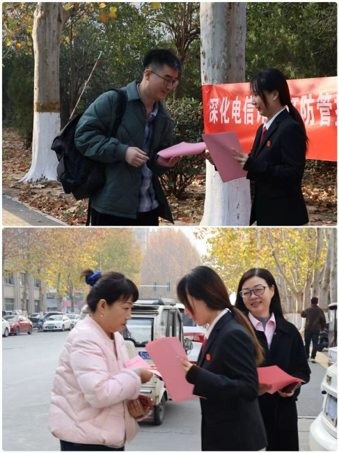为切实筑牢群众财产安全“防火墙”,提升辖区群众防范电信网络诈骗的意识和能力,12月8日上午,召陵法院组织刑事审判庭干警开展电信网络诈骗防范宣传活动,以“零距离”普法守护群众“钱袋子”。